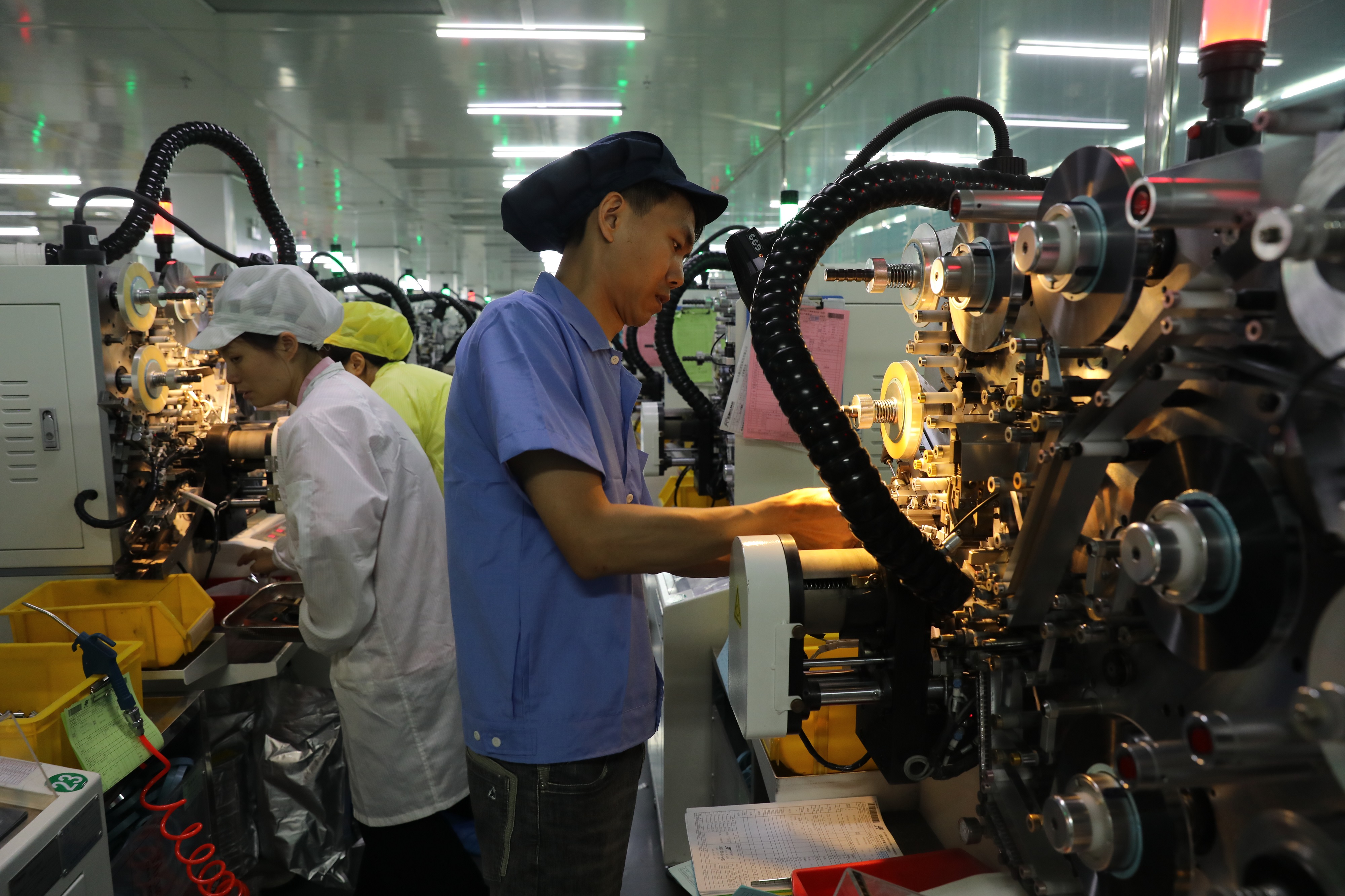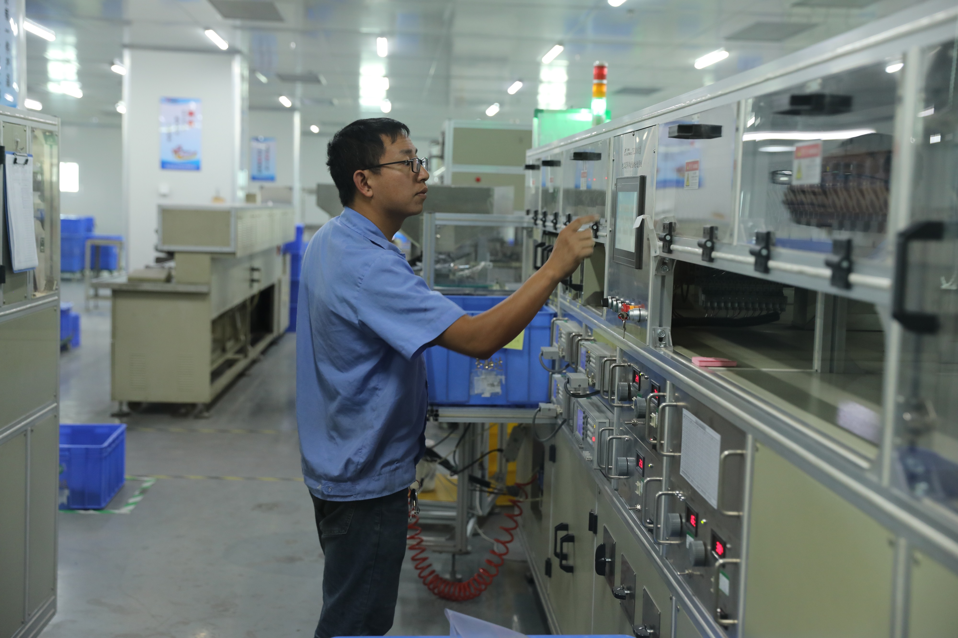 在公司薄膜事业部一车间,280多台卷绕机排列整齐,有序地将一卷卷薄膜绕成一颗颗电容芯片。每台机器顶部有一个报警灯,正常运转时,灯是绿色的,若材料用完或程序出错,灯变红色,并发出警报声。一车间每天要生产300万颗电容芯片,今年以来一直是满负荷生产。圣融达的电容器主要用于家电、新能源汽车、焊机等,在国内市场的合作品牌包括奥克斯、华为、小米、长虹、美的等。