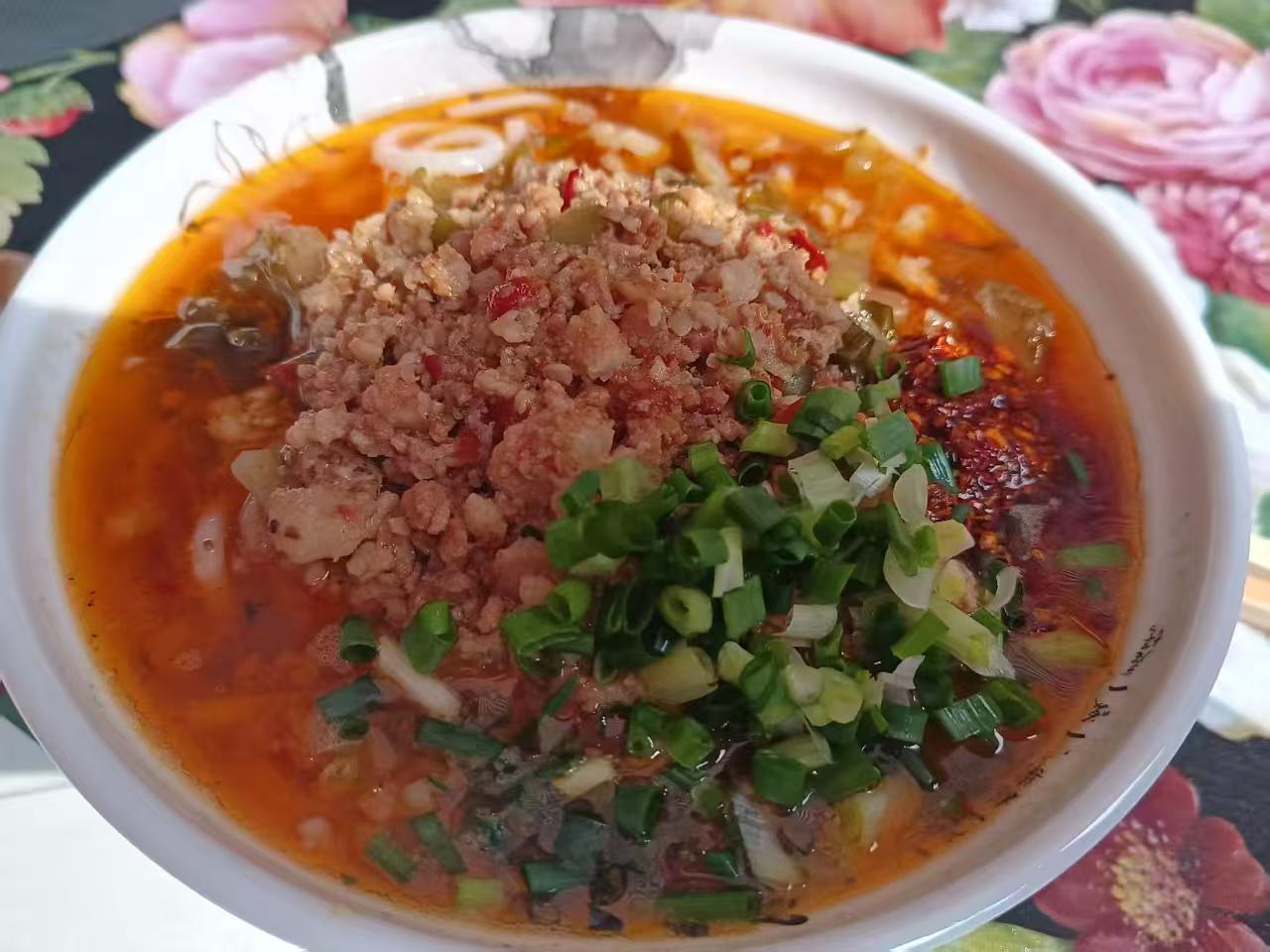 店内招牌风味酸菜米线,地道感全藏在“严选直供”的食材里:米线特意从贵州直发,是刘大姐对比多地后敲定的定制款,筋道弹牙、裹味十足,比普通米线更具口感优势;酸菜来自古蔺老坛慢腌,酸香纯粹,每一批都从老家直运泸州;筒骨按古蔺老店配方慢炖出清亮鲜醇的汤底,烫好的贵州米线盛入汤中,再铺一层现炒的臊子,撒上切好的古蔺酸菜与葱花——酸香裹着臊子的肉香浸满筋道米线,吃到的就是藏着匠心的家乡同款味道。