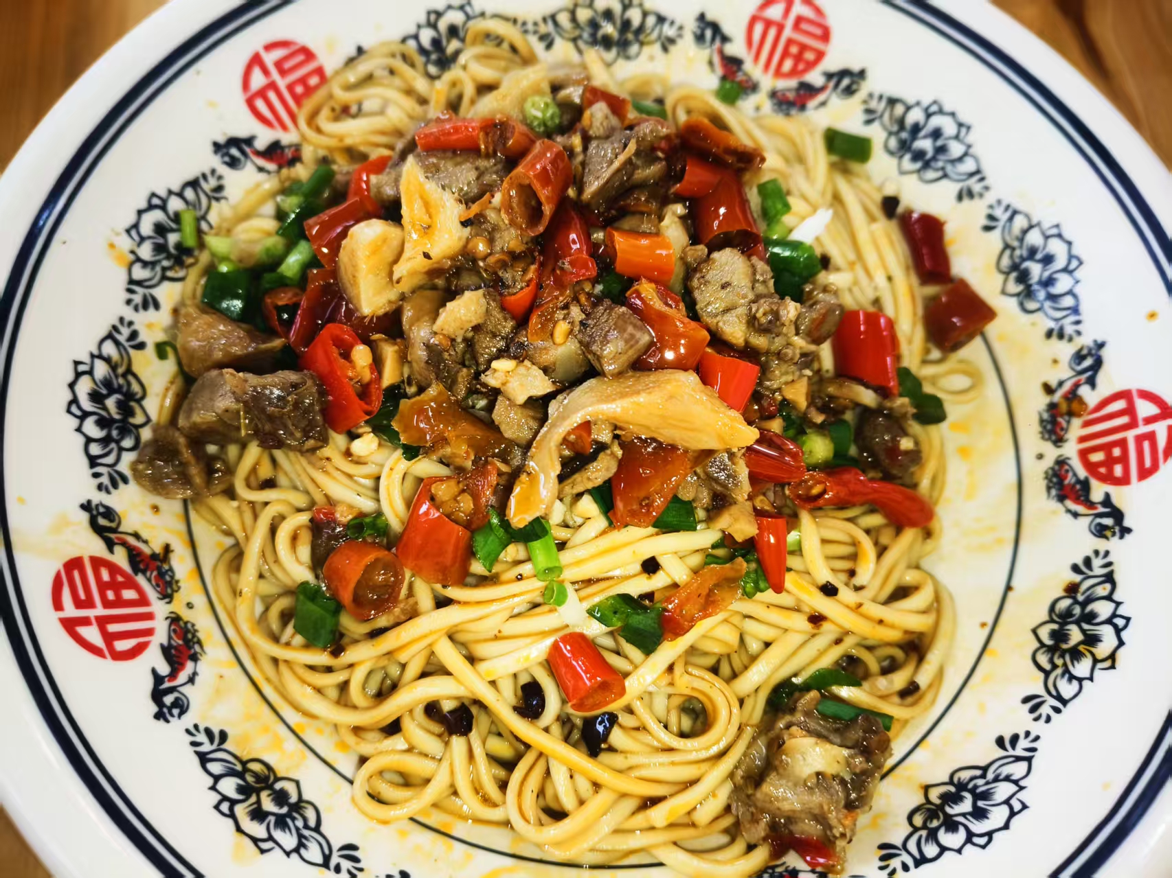 店里的招牌特色干牛杂面,更是鲜辣党的本命款。新鲜牛杂牛大肚处理得干净无腥,经泡椒、泡姜猛火快炒后,香辣鲜香牢牢锁在弹韧肌理中,嚼劲十足又不塞牙。面条裹满红油酱汁,铺上足量牛杂,撒上花生碎、葱花拌匀,酸辣鲜香层层交织,越吃越上头。