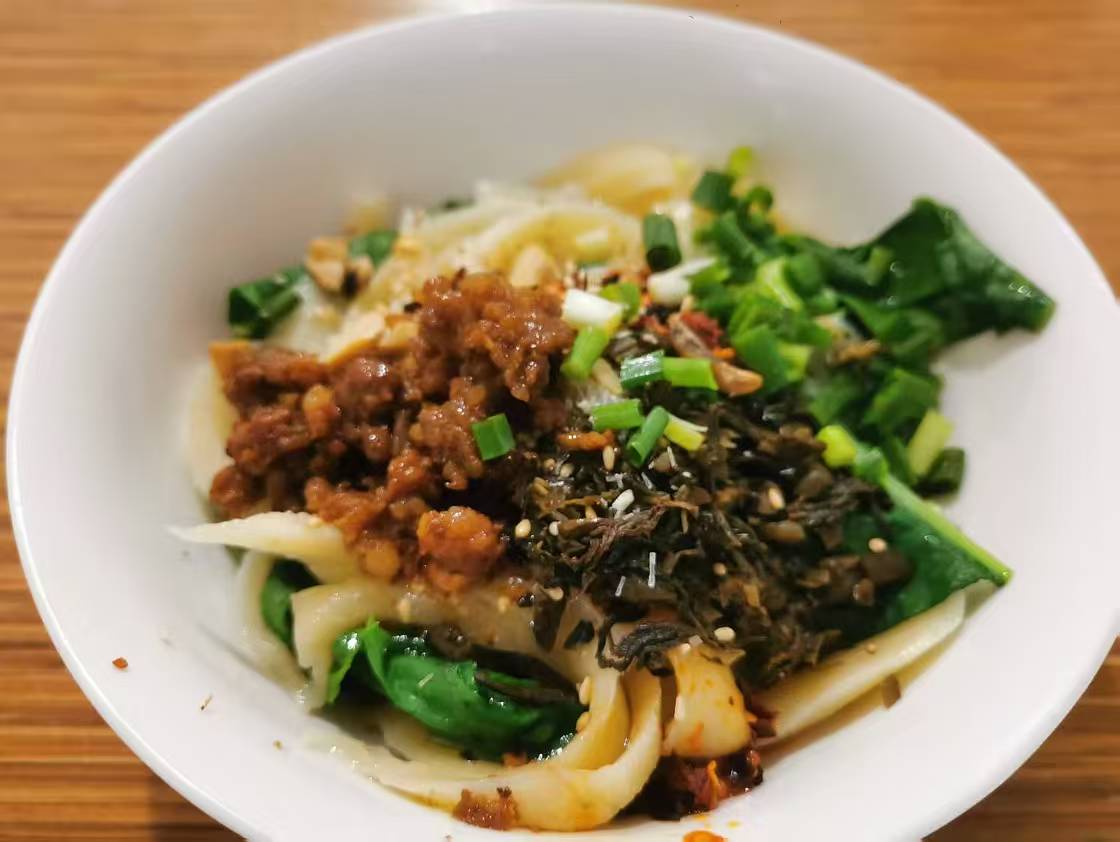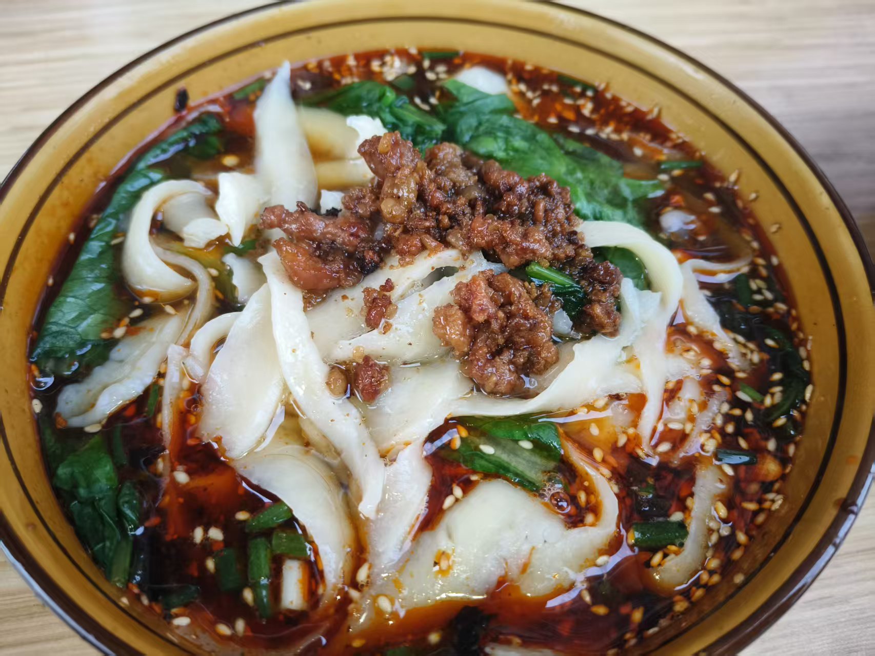 臊子是这碗面的“灵魂”:五花肉丁配甜面酱慢熬出酱香裹肉香的杂酱;土鸡与本地干辣椒爆出锅气十足的辣鸡臊子;跑山鸡加香菇、葱姜慢炖2小时的炖鸡汤底,汤汁浓白、肉质软烂,香菇的鲜香更添风味层次,如今仍是老客的“心头好”。“当年一两块钱一碗,现在六七块,味道跟以前一模一样!”从年轻吃到退休的张师傅刚坐下,熟门熟路喊了声:“一两辣鸡削,红油重,再加一两炖鸡削”。