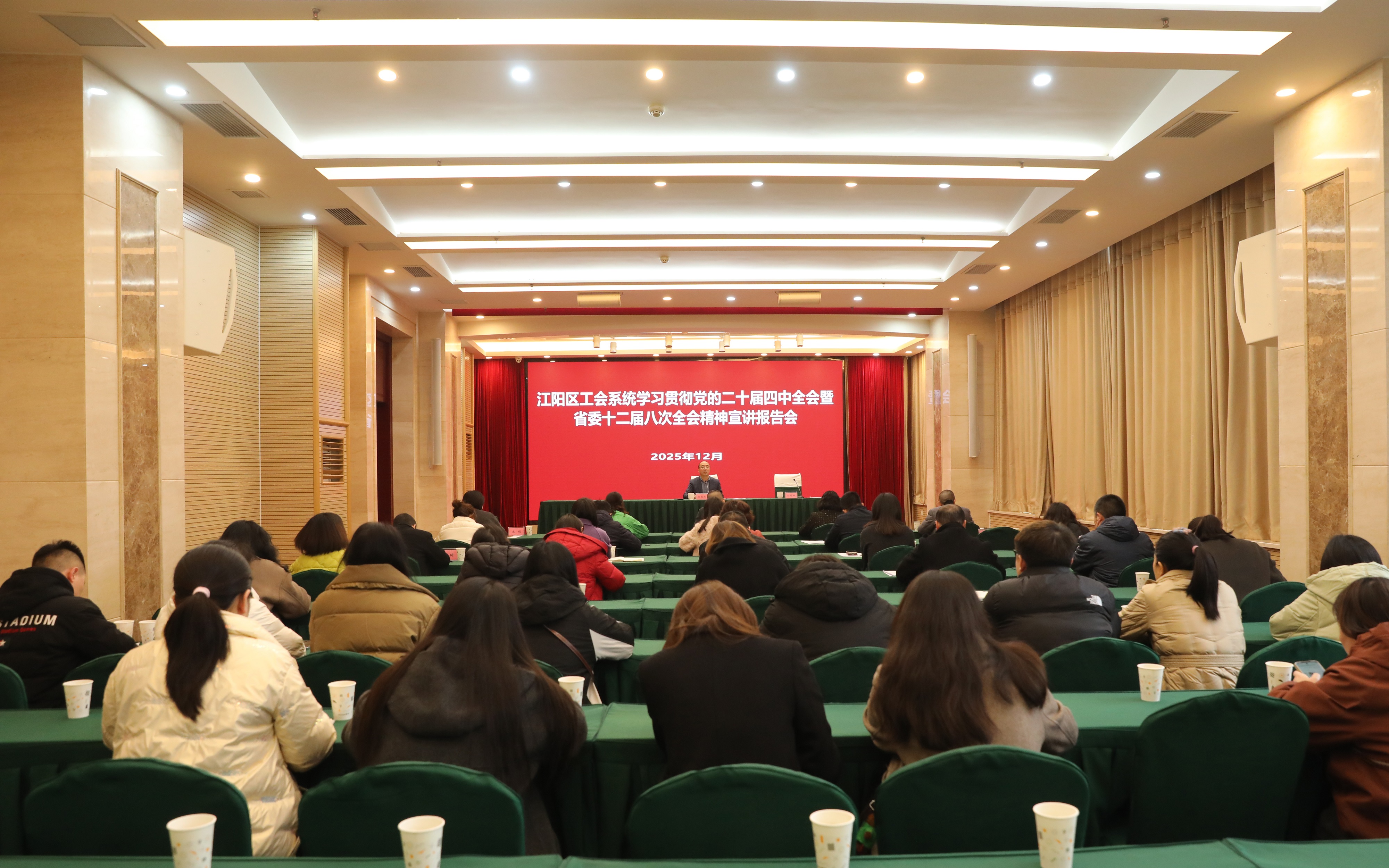 江潮讯(记者 袁玉华)12月12日,江阳区工会系统学习贯彻党的二十届四中全会暨省委十二届八次全会精神宣讲报告会举行,区委常委、区总工会主席刘忠杰作宣讲报告。区总工会第五届委员会委员、全区工会社会工作者参加会议。