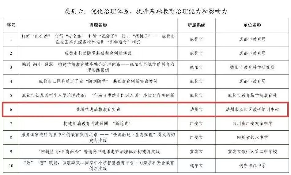 江潮讯(记者 张红)近日,四川省教育厅2025年基础教育创新实践案例评选结果揭晓,泸州市江阳区报送的《县域推进品格教育实践》案例荣获“优化治理体系,提升基础教育治理能力与影响力”类别奖项。这一荣誉,标志着江阳区自2022年成为全省品格教育成果推广首批实践引领单位以来,历经三年系统探索,成功构建出具有区域特色的品格教育推进模式,实现了从“点上开花”到“全域结果”的跨越。