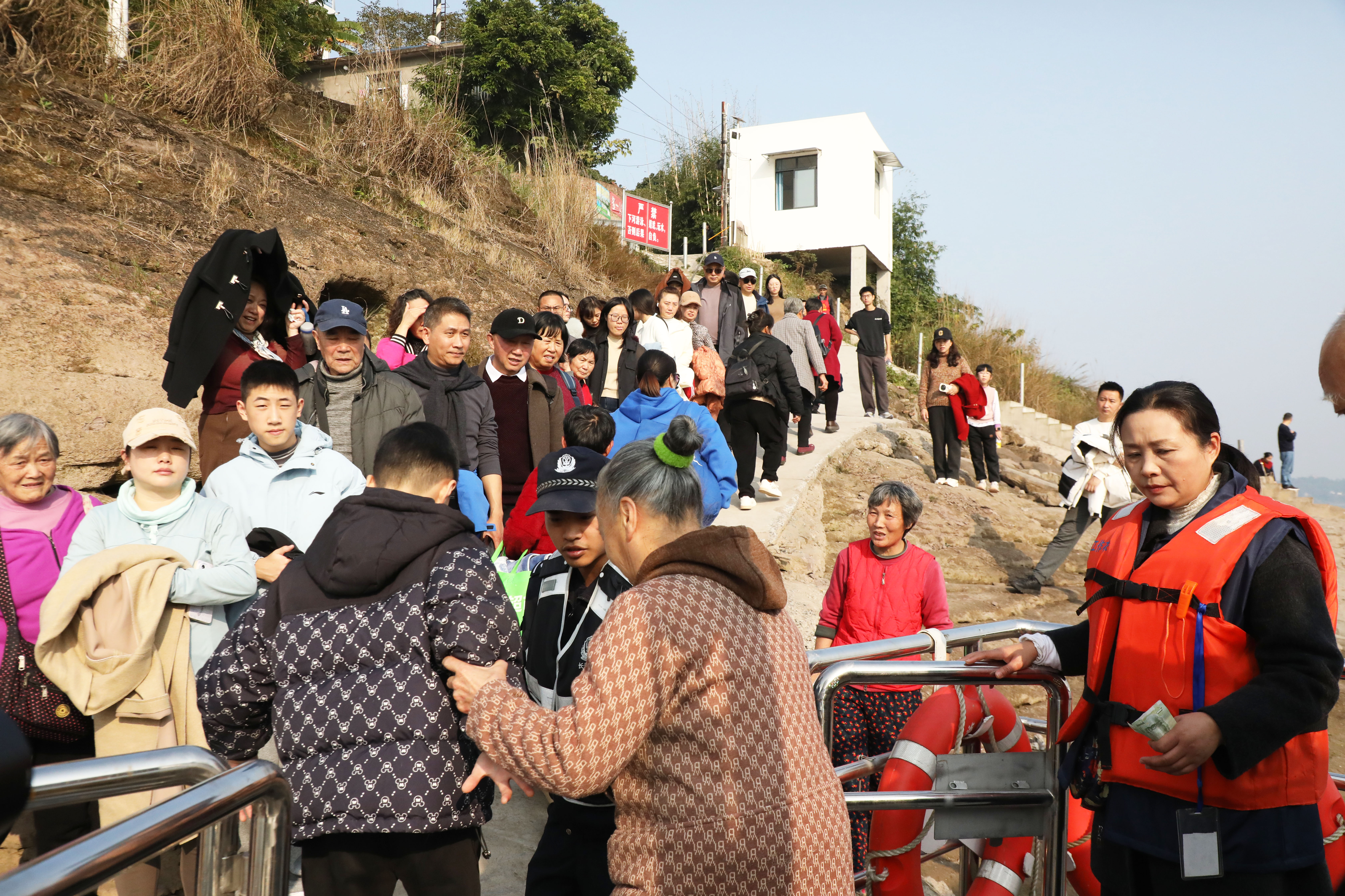 江潮讯(记者 张红)“各位旅客,渡船即将开航,请规范穿好救生衣,坐稳扶好。”1月27日,在江阳区黄舣镇弥陀渡口,工作人员正在引导乘客有序乘渡。随着春运临近,渡口秩序井然,安全保障工作细致周密。